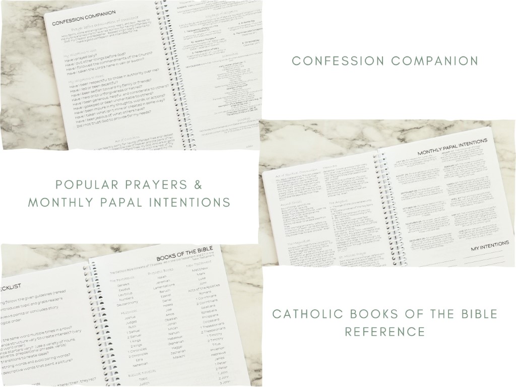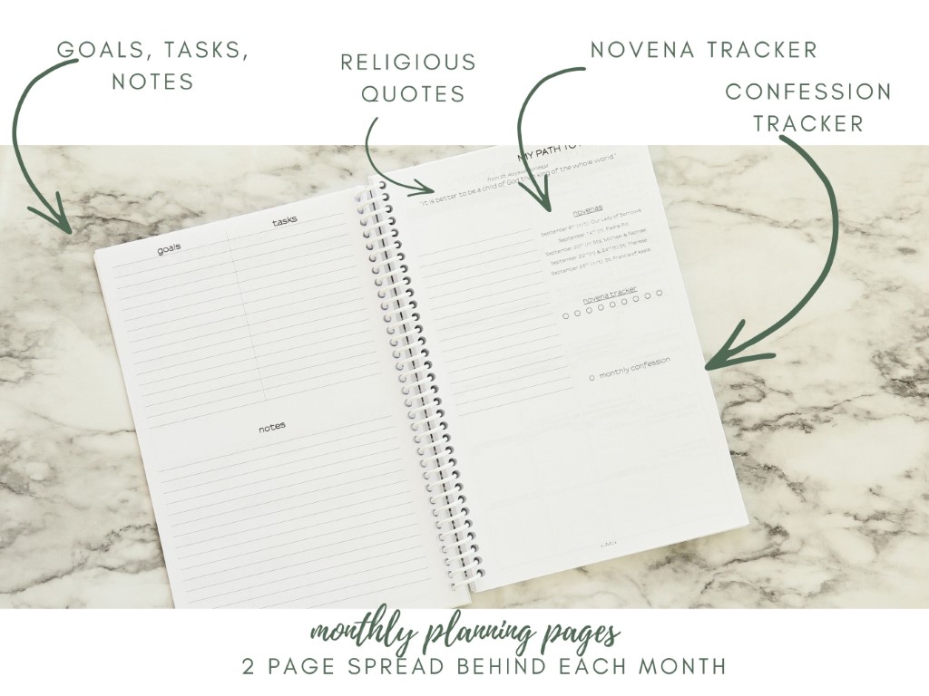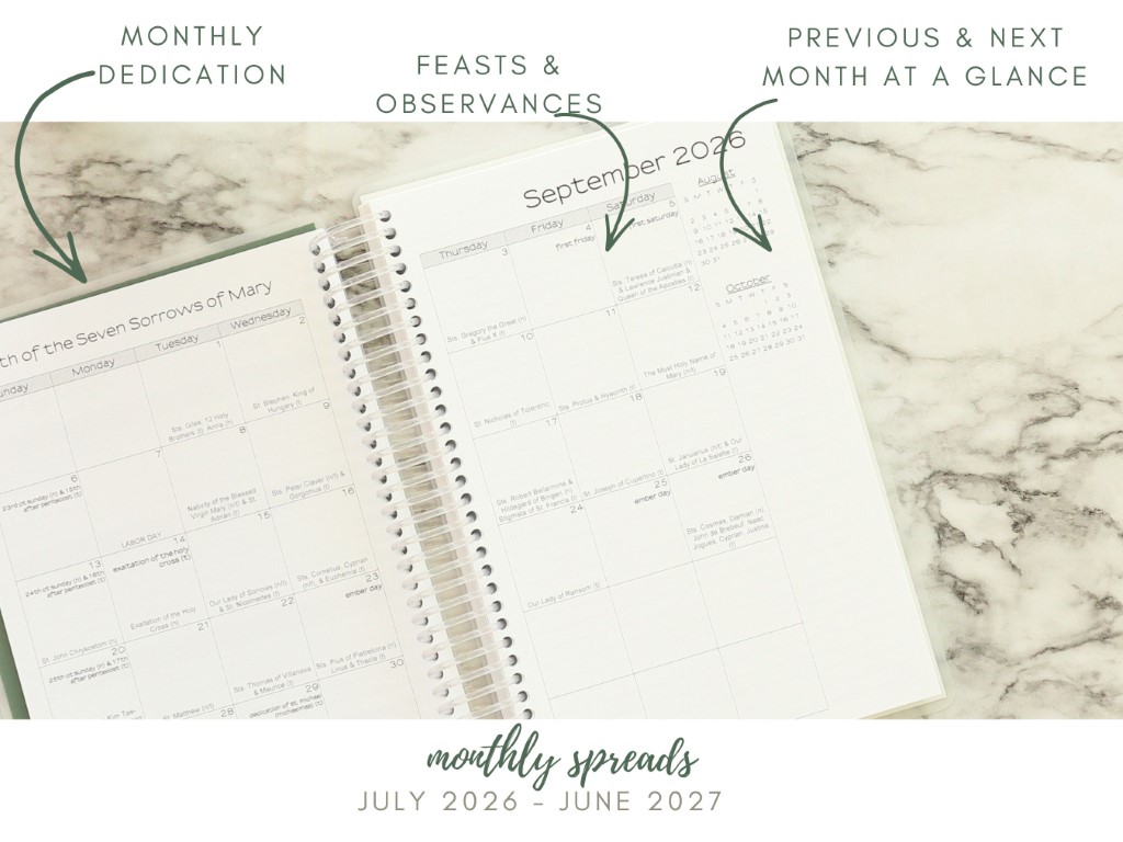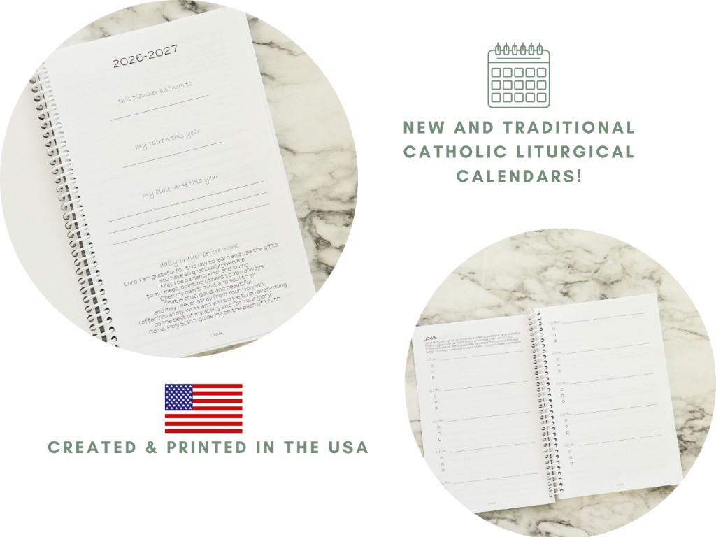 This planner combines the current (Novus Ordo) and traditional (1962 Roman Missal, Latin Mass, TLM) Catholic liturgical calendars.